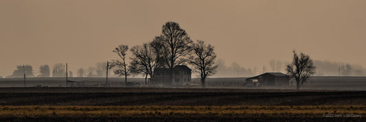 What the Central Plains lack in mountains they certainly make up for with dramatic clouds and lighting! Later on the morning I took the nature image "Drake Lake: Fog at Dawn," I was driving home through the rising fog and had to pull over when I saw this moody panoramic image: dramatic clouds, god rays, and distant homesteads on the Illinois Plains.