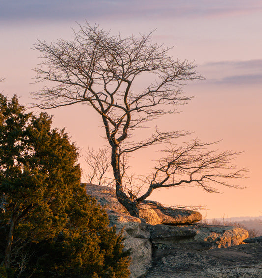 One of my favorite places in Illinois is Garden of the Gods at the southern tip. It has dramatic sandstone cliffs overlooking the gently rolling wooded hills of the area. I came out for sunset on this particular evening to make this landscape photography image the glow of the pastel sky on the sandstone cliffs.