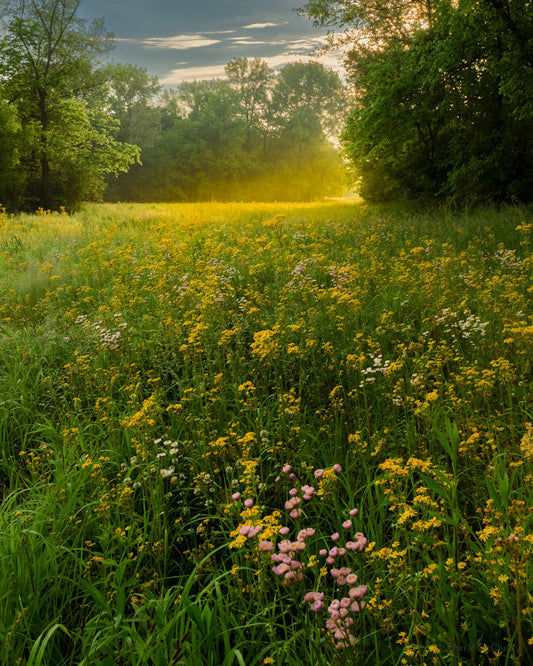 When I saw the golden glow of sunlight on the last of the morning mist, I knew this would be a beautiful landscape photography print. The image is only enhanced by the pink, yellow, and white flowers nestled in the lush spring grass at Beaver Dam State Park Illinois.