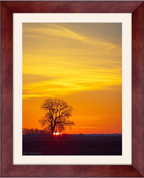 As with the sister nature image "Lone Tree at Sunrise," I love the silhouette of the lone tree, the thin slip of sun peaking above the horizon, and the wispy cirrus clouds glowing in the sunrise. The warm colors of this nature image are in stark contrast to how I felt: the 10 degree F temperature and bitter wind made my face, fingers, and toes feel quite blue!