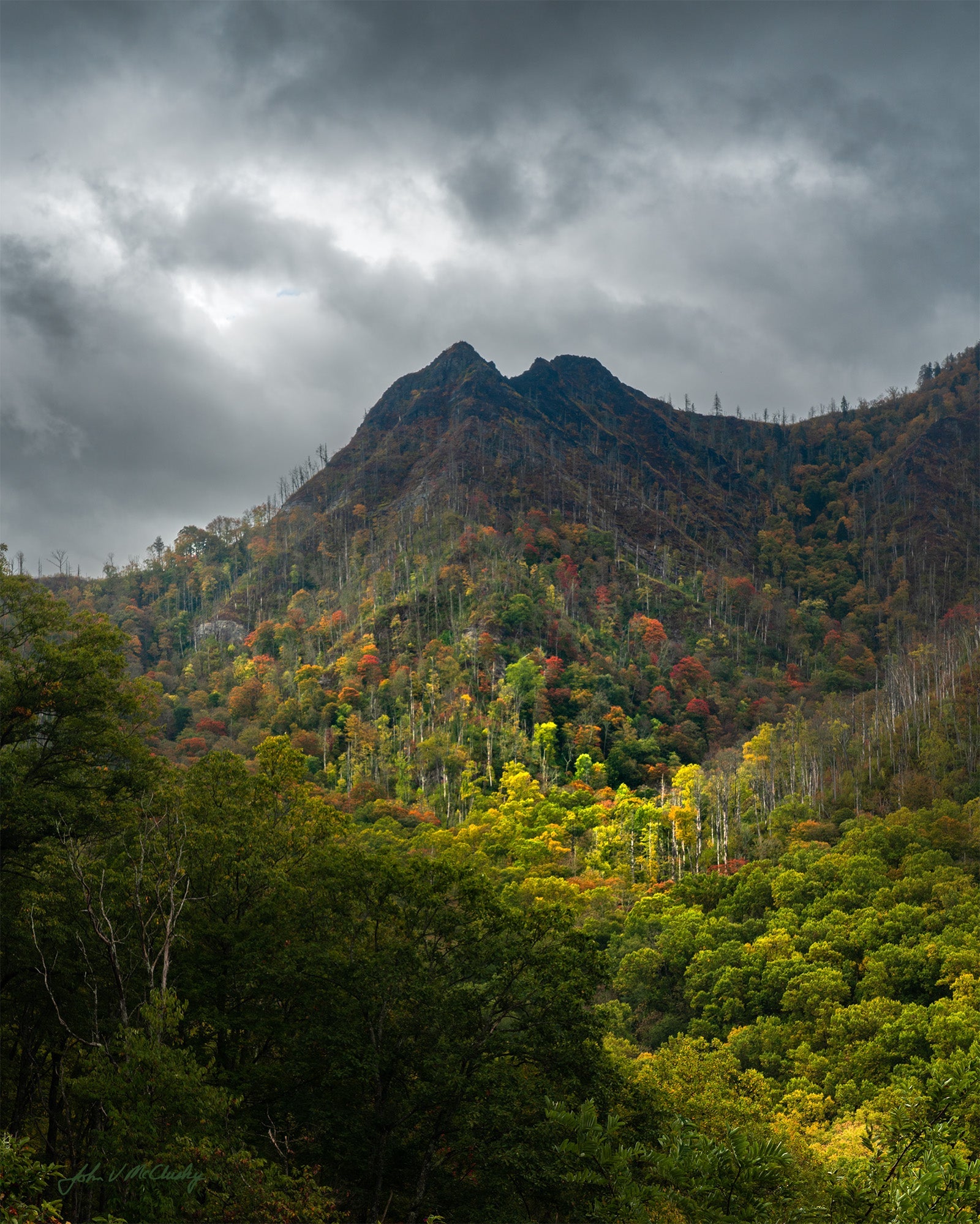 My wife and I visited Smoky Mountain National Park while trying to decide where to move for the next stage of our careers. It was wet and rainy with intermittent sun on the day I took this landscape image. I had been reveling in the early fall color and dramatic clouds all day, but hadn't had any luck putting it all together to make a great nature photo .... until I saw a sunbeam approaching this valley. Happily we were able to safely park for me to get the picture!